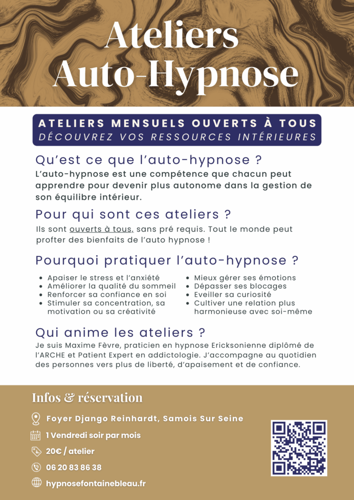Ateliers mensuels d’autohypnose, animés par Maxime Fèvre, ouverts à toutes et tous, sans prérequis. A Chaque séance un thème différent (sommeil, stress, confiance, exploration etc.) pour apprendre des techniques simples et puissantes pour prendre soin de vous, dans une ambiance conviviale et bienveillante.