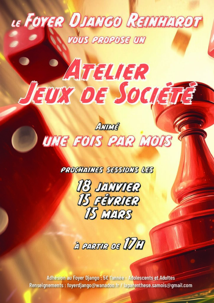 Ces ateliers sont organisés en partenariat avec « La Parenthèse » et sont animés par Julien Minet. Un thème par atelier (jeux vinted, shut the box, loup garou, stratégie, invention, ou encore Skyjo, Speed bac, Crack list, Traîtres à bord, -2 pommes 3 pains, Qwixx…).